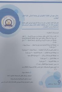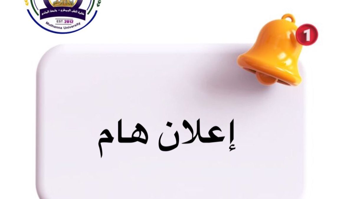 29 أكتوبر,2025تُعلن كلية الطب البيطري – جامعة المثنى عن بدء مرحلة التسجيل الورقي للطلبة المقبولين للعام الدراسي (2026–2027)، وعلى الطلبة الأعزاء مراجعة شعبة التسجيل في الكلية خلال أوقات الدوام الرسمي، مع جلب جميع المستمسكات المطلوبة لإكمال إجراءات التسجيل.