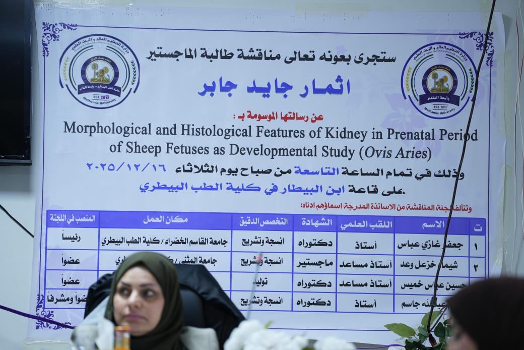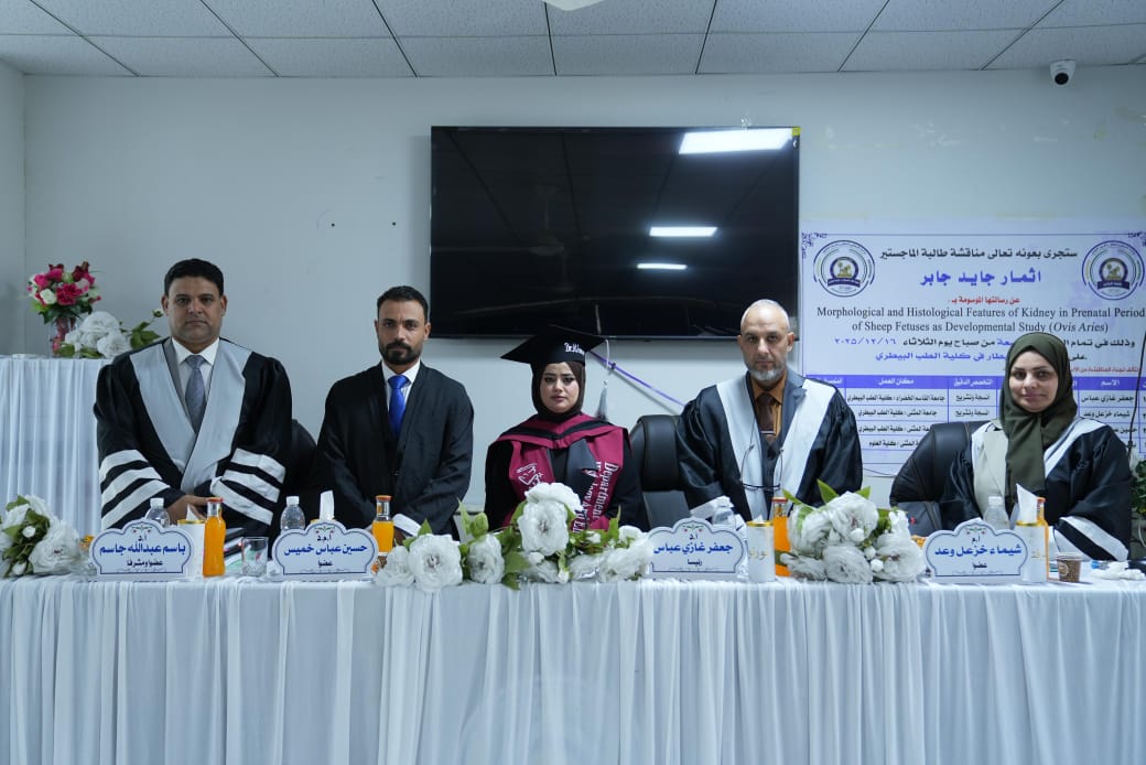 18 ديسمبر,2025جرت في كلية الطب البيطري – جامعة المثنى، مناقشة رسالة الماجستير الموسومة: